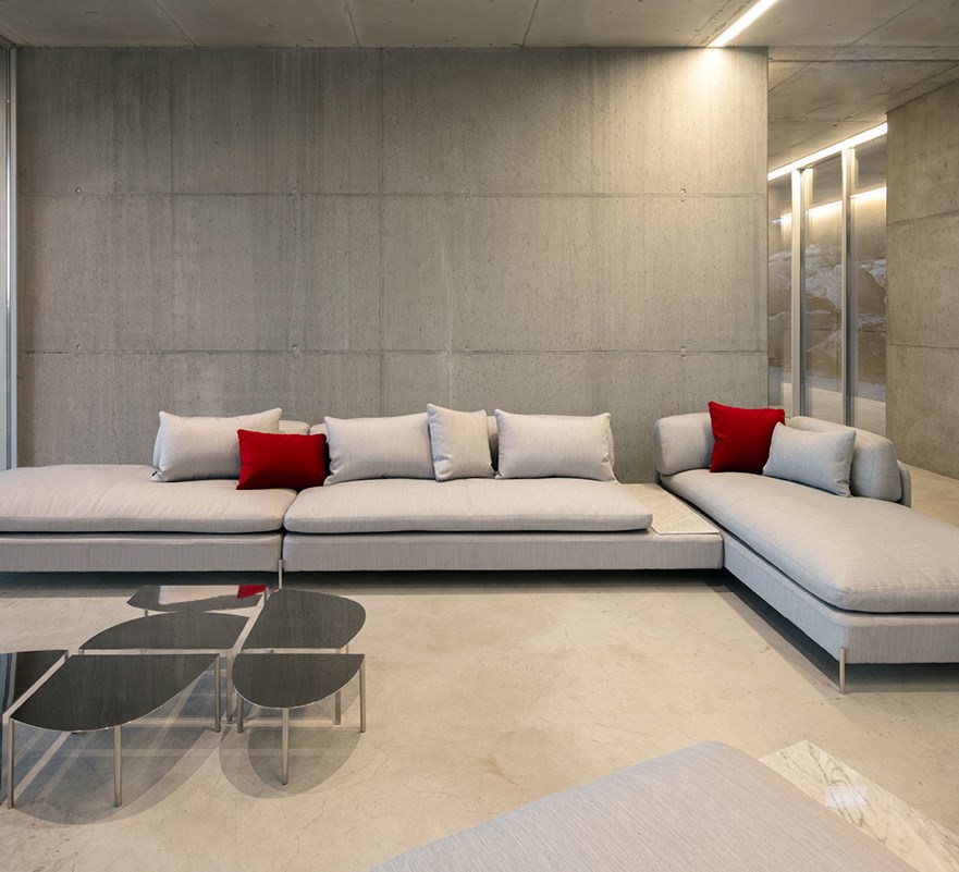 Součástí pohovky Alicia jsou integrované stolní desky, díky nimž ji lze přetvořit ve společenský prostor.