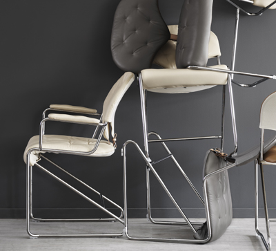 - Sedací část z chromovaných trubek a černé nebo zelené podkladové tkaniny s koženými okraji