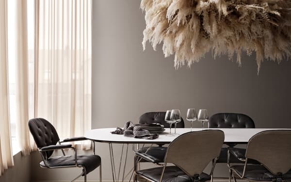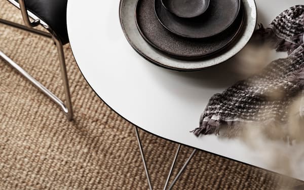 Kulatý jídelní stůl vybízí hosty ke konverzaci a očnímu kontaktu. Je také dostupný v dalších dvou verzích: jako jídelní stůl se dvěma prodlužujícími částmi a jako menší kávový stůl.