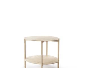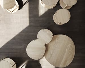 Dřevěný stůl Lunaria nepravidelného kulatého tvaru. Stůl střední velikosti lze snadno umístit vedle pohovky nebo lůžka.