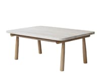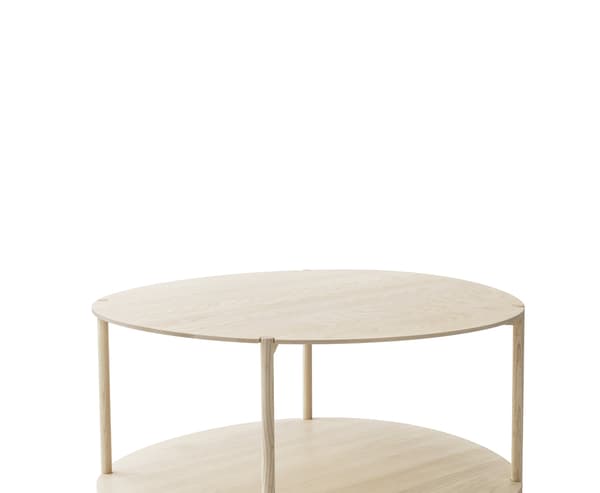 Dřevěný stůl Lunaria nepravidelného kulatého tvaru. Stůl je většího průměru, ale je nižší než jiné modely řady Lunaria.